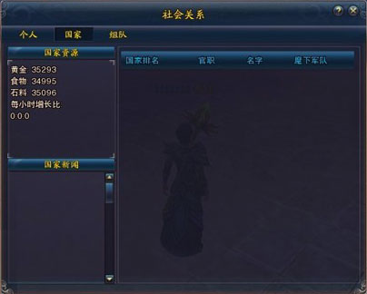 玩家在第一次进入游戏时必须在晨星国、映月国、烈日国三个国家选择其中一个国家成为这个国家的子民。国家的利益和国民息息相关,从确定了自己的属国开始,玩家就有了义务为自己属国的荣誉奉献一切。 不同的国家具有不同的地域特征、宗教信仰以及资源分布,由于资源的紧缺,三个国家的关系一直处于敌对状态,经常发生国战。平时也经常发生边境资源掠夺的关系。 帮派的帮主可以带领帮派参加所属国家内的国王争霸战。击败其他的帮派后可以成为国王。该帮派其他成员也将得到国家军队的称谓。新手